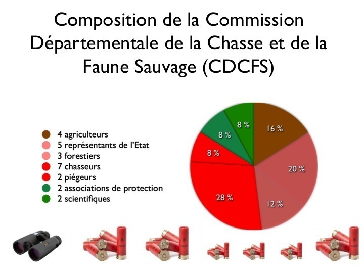 On remarquera que la CDCFS compte en séance plénière 25 membres dont 5 représentants de l’état, 7 chasseurs, 4 agriculteurs, 3 forestiers, 2 piégeurs, 2 représentants des protecteurs de la nature et 2 scientifiques. Cette commission donne un avis au préfet sur toutes les questions relatives à la gestion de la faune sauvage et à la protection de ses habitats dans un département. Alors on peut légitimement s’étonner de sa composition :En Isère la faune compte 330 espèces de vertébrés, plusieurs milliers d’invertébrés et 84 espèces chassables (dont 6 espèces classées nuisibles en France, 6 en Isère et 3 pouvant être classées nuisibles annuellement). Or, si on compte le représentant de l’ONCFS et de l’association des lieutenants de louveterie parmi les représentants de l’état, on obtient, en Isère 11 chasseurs sur 25 membres. Si on ajoute le représentant de l’ONF qui obtient une partie de ses revenus par les activités cynégétiques en forêt domaniale (600 000€ par an en Isère), la CDCFS est presque à moitié composée de personnes favorables aux chasseurs. Les scientifiques, les protecteurs de la nature sont minoritaires, les élus locaux, les professionnels du tourisme nature et les chasseurs photographes sont absents alors que seulement 25% des espèces de vertébrés sont chassables et que la faune sauvage est un bien commun de la société. En Isère qui compte aujourd’hui 1.197 038 habitants, on recense 23 610 chasseurs (Soit 1,97% de la population) et 12 000 adhérents aux associations FRAPNA (Soit 1% de la population)