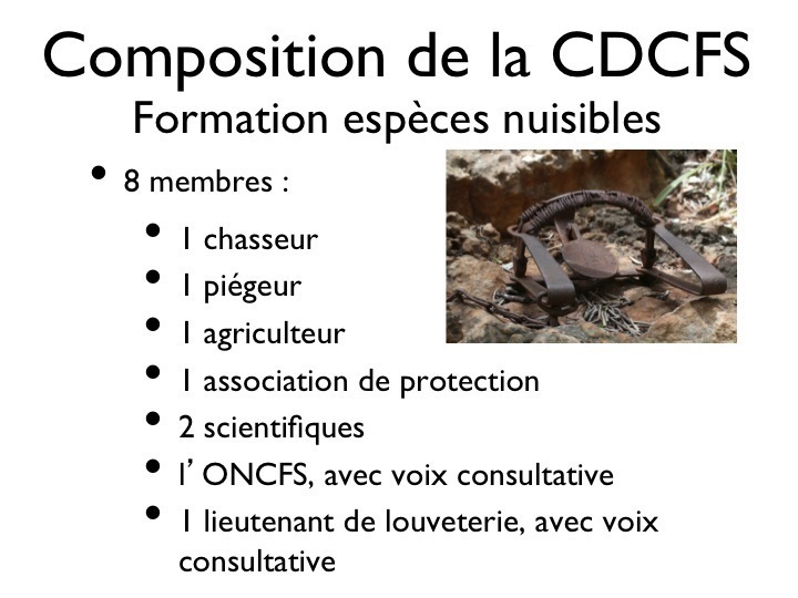 Pour les écologistes j’ajoute que j’étais d’ailleurs tellement qualifié dans les débats concernant le classement des espèces nuisibles que le préfet finit par m’exclure sans excuses ni remerciements pour le temps et l’énergie consacrés à l’intérêt général. Pour parler de notre sujet il importe, dans un premier temps, de bien connaître les protagonistes : la CDCFS et les piégeurs. Je m’attacherai principalement au département de l’Isère dans cet exposé.