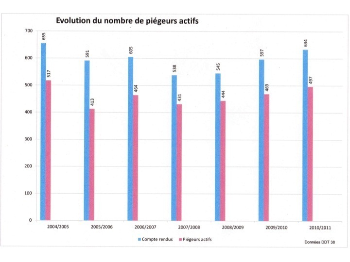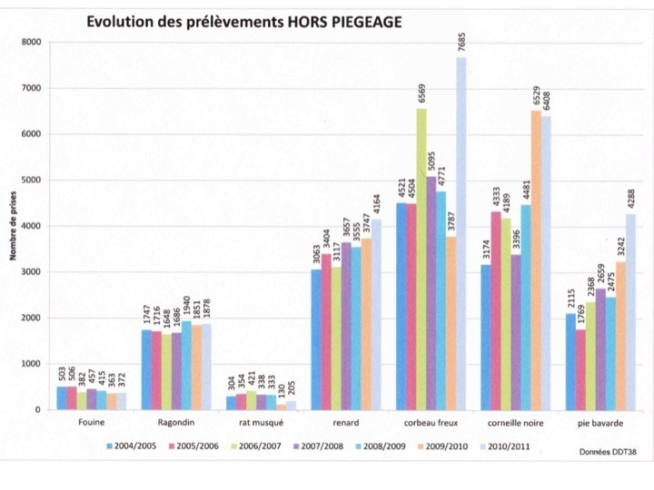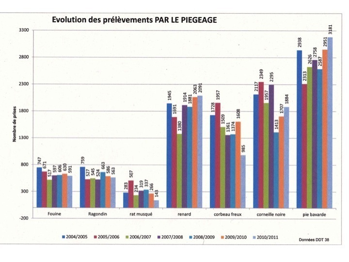 Une très instructive enquête sur les bilans de piégeage en France a été publiée en 1998 par l’ONCFS.Je cite : « Dans plus d’un tiers des départements, la proportion de communes ayant transmis des déclarations de piégeage n’atteint pas 10%.Il n’est pas possible de savoir si ces résultats correspondent à des variations dans l’exercice du piégeage ou a des variations dans le suivi de cette activité par les DDAF, les mairies ou par les piégeurs (et par conséquent à un non respect de la réglementation). Je cite encore : « La part des corvidés indéterminés est très importante et représente 28% des prises d’oiseaux » et « le détail des captures par catégorie ou type de pièges n’est disponible que dans 44 départements ce qui ne représente que 36% des prises ».Enfin : « Il ressort de cette enquête que, sur de nombreux points, l’application qui est faite de la réglementation en vigueur ne permet pas d’obtenir une image précise du piégeage en France. »En Isère la DDT tente de suivre l’activité de piégeage et le respect de la réglementation. 28 piégeurs sur 500 actifs ont été suspendus en 2012 pendant une année pour non transmission de leur bilan. Une analyse des résultats annuels de captures par espèce ne permet même pas de déceler une évolution démographique car la pression de piégeage n’est pas identique chaque année. Le nombre de piégeurs actifs, de pièges posés, l’expérience des piégeurs, la destruction des espèces visées par la chasse ne sont pas comparables d’une année sur l’autre.