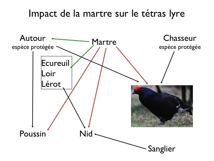 Ainsi les chasseurs prétendent que la martre menace la survie du tétras lyre et de la gelinotte. C’est faux car cette prédation existe depuis des milliers d’années, bien avant l’apparition des chasseurs et elle s’exerce aussi sur les autours des palombes qui capturent ces oiseaux et sur les loirs ou écureuils qui peuvent consommer les œufs du rapace et des gallinacés. Il s’agit là uniquement de détruire (et non de réguler) un carnivore concurrent du chasseur. Une étude de l’ONCFS en 2001 conclut ainsi : « Il n’existe pas d’étude française sur l’impact particulier de la martre, du putois et de la belette sur une espèce gibier ». Il importe donc de regarder objectivement les dégâts opérés par la faune sauvage sur les activités humaines et de trouver des solutions. Il faut ici dénoncer l’aspect psychologique, voire psychiatrique, du comportement humain. Prenons un exemple en Isère : tout un village s’est réuni pour protester à grands cris contre un castor qui avait osé couper un peuplier planté dans le lit majeur d’une rivière.