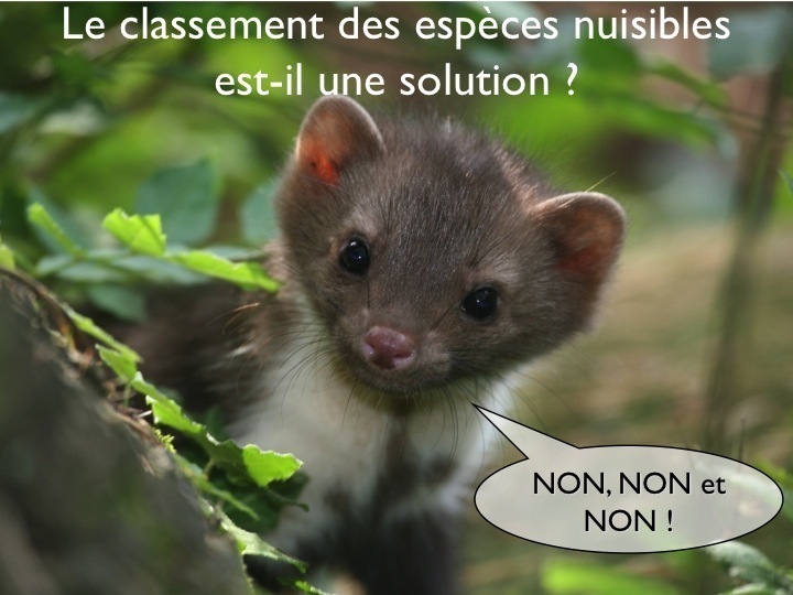 Personne ne conteste que le sanglier, le pigeon ramier ou le lapin commettent des dégâts en agriculture et pourtant ces trois espèces ne sont pas classées nuisibles en Isère. On voit là une discrimination positive de la part des chasseurs qui espèrent prélever ces gibiers à leur profit sans promesse d’obtenir la diminution des dégâts. On notera aussi que les chats et chiens errants ne sont pas classés nuisibles alors qu’ils sont responsables d’importants dégâts et que les chasseurs réclament la régulation du loup et du renard alors que ces prédateurs prélèvent des sangliers et des lapins. Il n’y a donc aucune logique dans cette politique qui classe nuisible le renard dans les secteurs de prairie impactées par des pullulations de campagnols terrestres et des champs alors qu’un renard adulte en consomme de 6000 à 10 000 par an. Comprenne qui pourra ! Notons que la DREAL Haute Normandie a présenté en 2010 un rapport à la CDCFS démontrant que les destructions des belettes, fouines, putois et martres dans l’Eurre ont coûté 105 000€ par destruction de prédateurs auxiliaires de rongeurs.