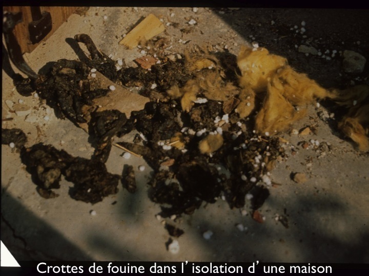 Il est courant que des fouines pénètrent dans les toits des bâtiments et commettent d’importants dégâts dans leur isolation. Pour l’association des piégeurs il suffit de tuer l’animal pour régler le problème. C’est idiot car on risque d’avoir des cadavres de petits dans un plafond ou d’autres fouines qui remplacent celle détruite si les accès n’ont pas été obturés. Il est bien préférable d’appréhender le problème scientifiquement, de déterminer le nombre et le statut de ces fouines dans le site et d’empêcher les accès après la sortie de tous les animaux tout en leur offrant un gite à proximité. On pourra alors profiter de la prédation de ces fouines sur les rongeurs autour de la maison et observer en famille les jeux nocturnes des petits.